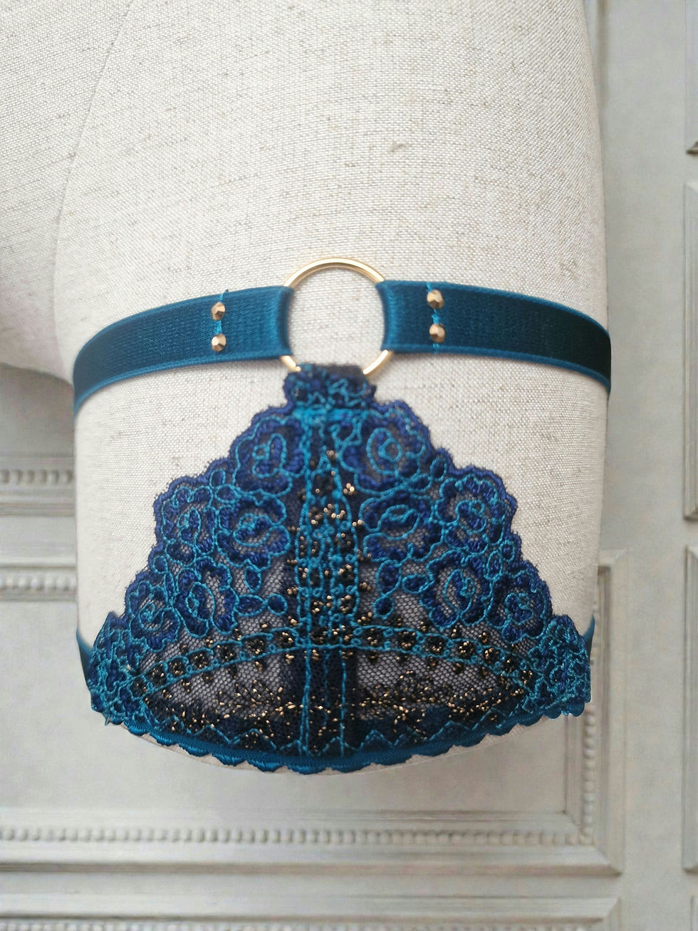 The Goddess collection features an exquisite, high-end metallic-gold French lace, in a very limited stock, olive French poly-satin with elasticity, 24kt gold plated hardware, and Italian gold satin elastics.